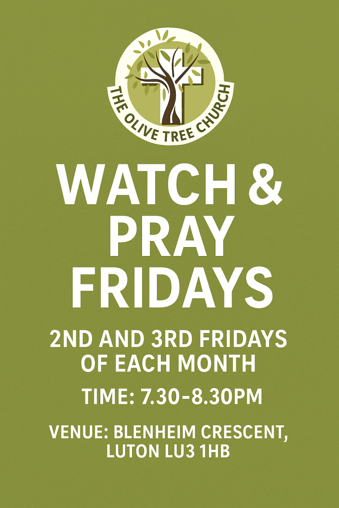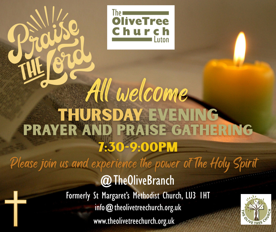 We now have a weekly prayer meeting at the Olive Tree Branch ( formerly St Margaret’s Methodist Church, Montrose Avenue, near the Biscot Mill roundabout) every Thursday at 7:30pm to 8.30pm. Please join us as we explore how to pray for ourselves and others, and experience the power of God’s Spirit through prayer and more!